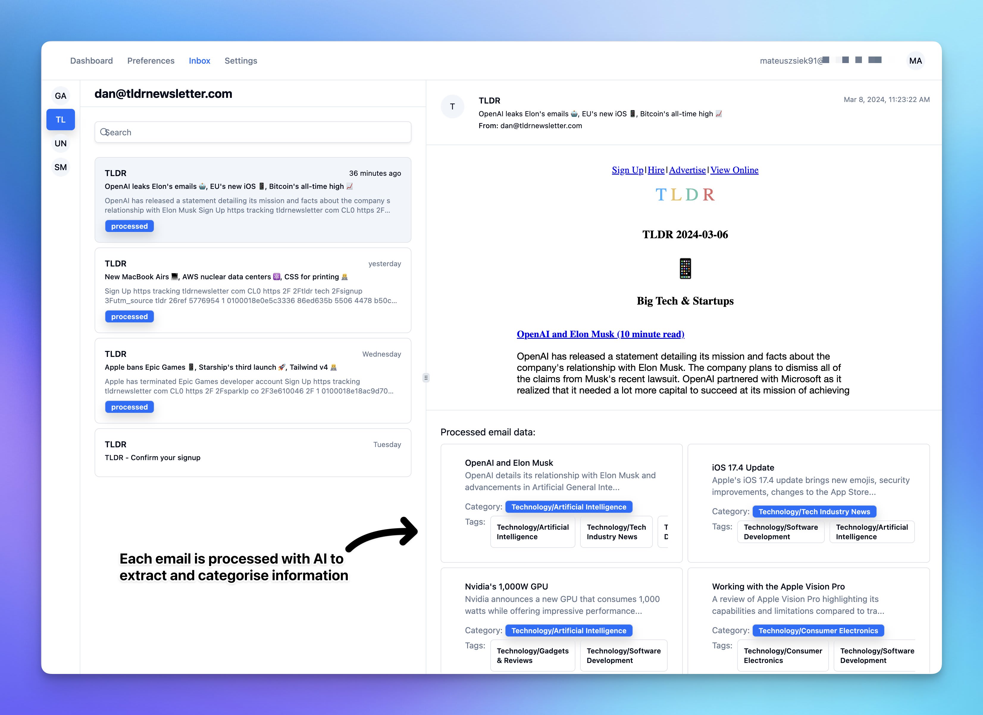 Once email is successfuly processed and saved in the DB we can display it in the UI focusing only on the pieces of newsletters that are important to user based on their interests. We can also prepare a summary and send it to user in a selected interval