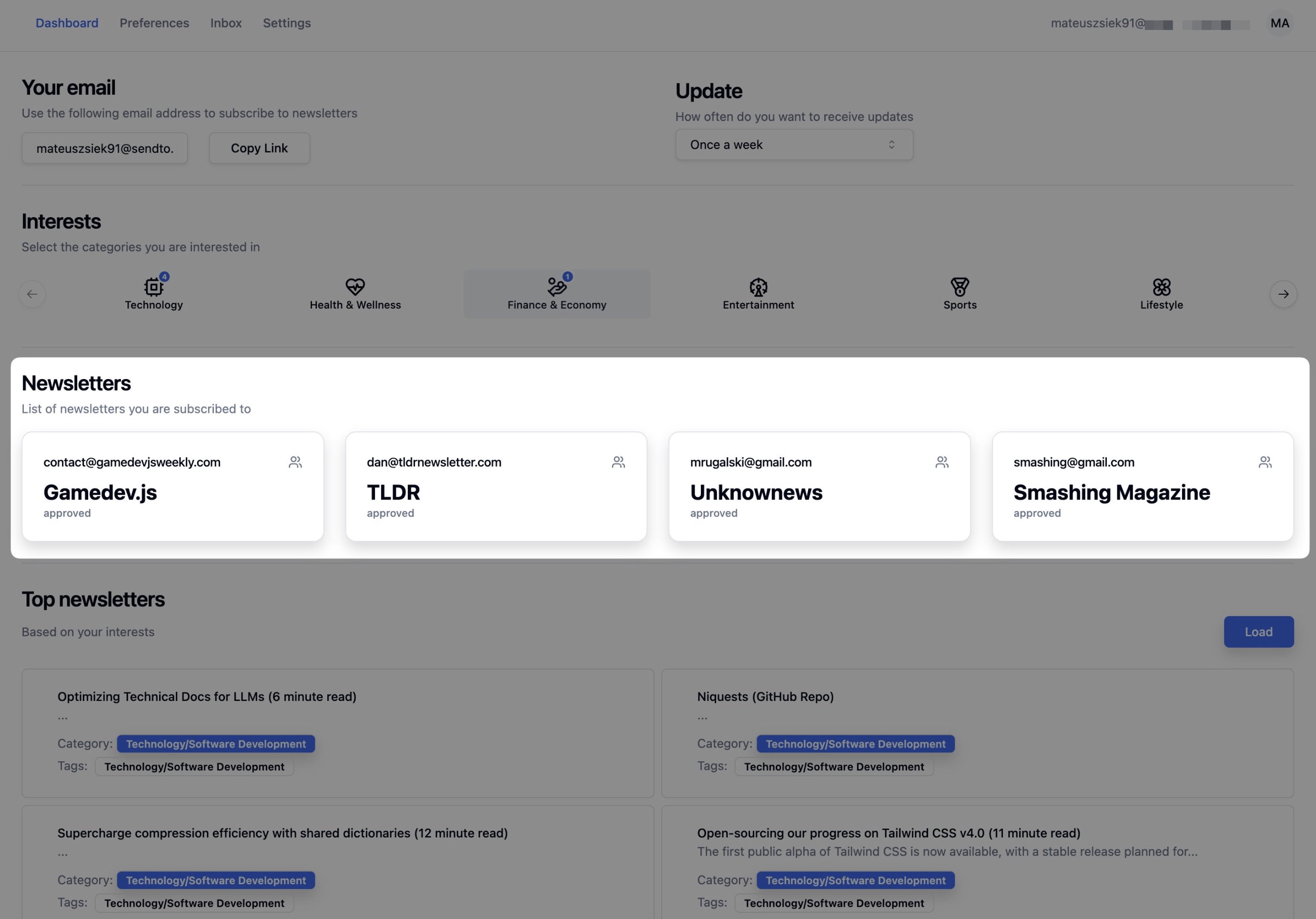 My idea for this project was that each user would receive unique email address which they can use to subscribe to various newsletters. This way my tool would have access to incoming email. Once the system receives the email I'd use AI(LLM) for processing the emails and filter its content based on user interests.